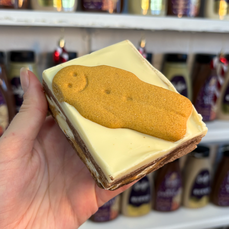 A fudgey gingerbread flavour white chocolate blondie filled with a layer of biscoff spread, topped with a thick layer of white chocolate & a gingerbread man!